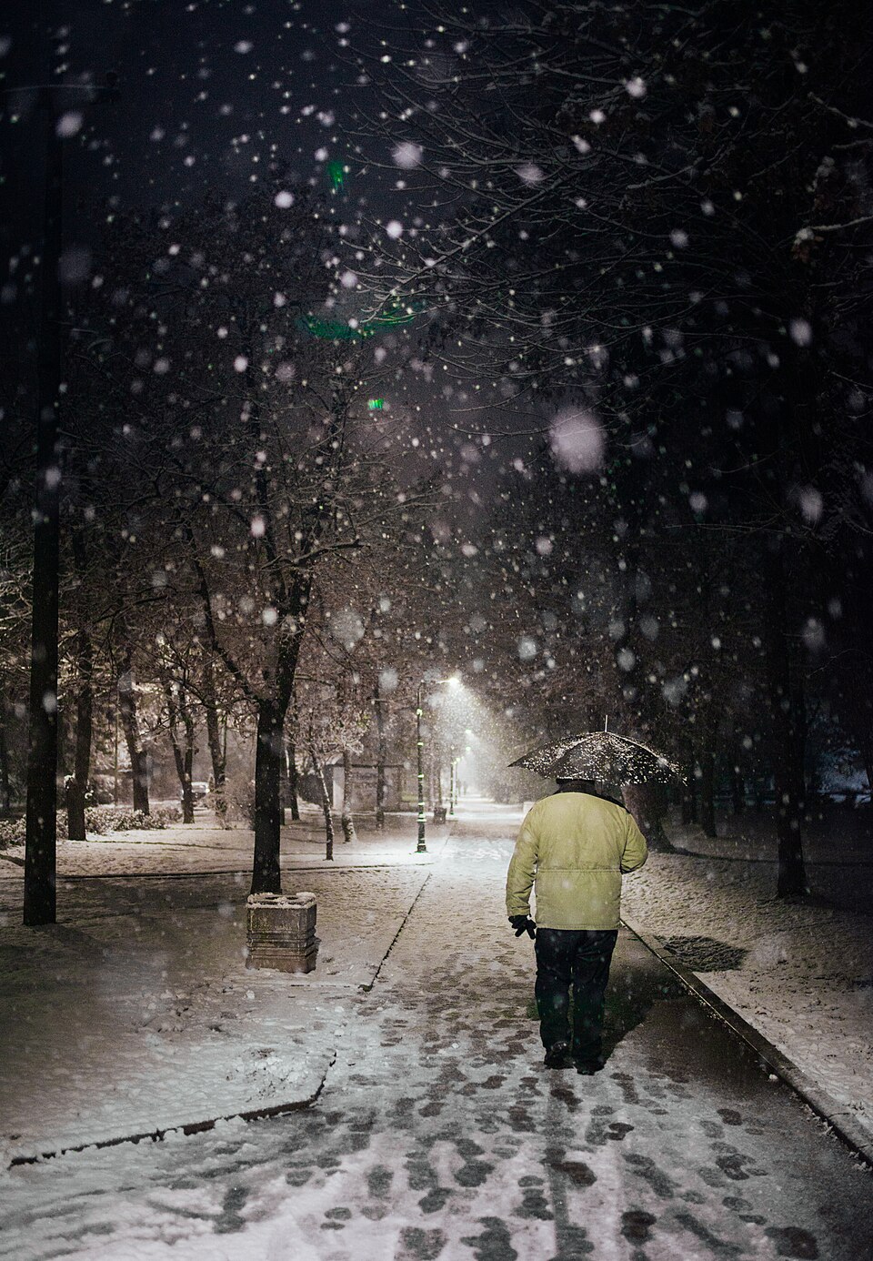 Look closely at this image of an “Old man in green jacket walking on snow covered sidewalk through an alley of trees.”