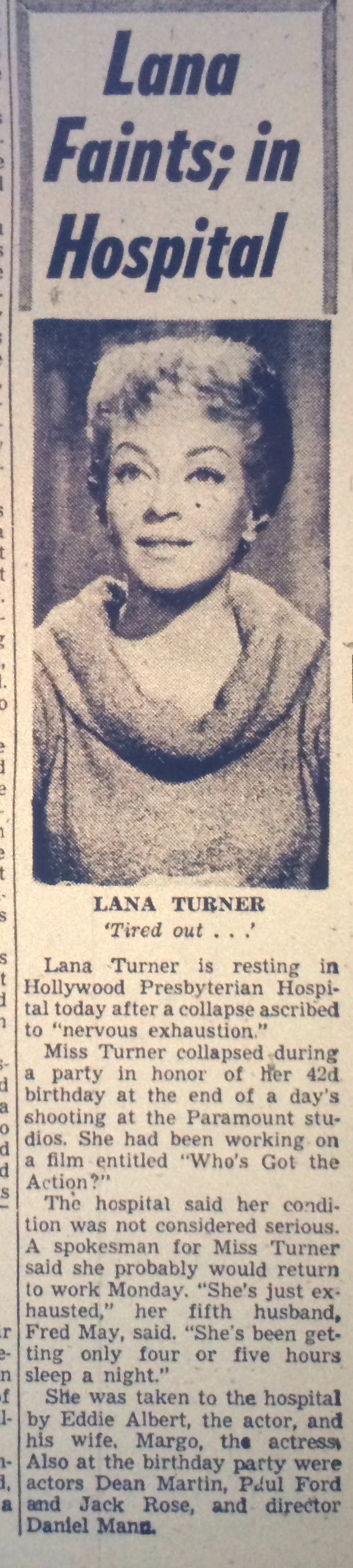 Closely look at the headline and article, “Lana Faints; in Hospital,” New York Post, February 9, 1962.