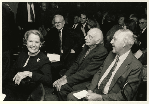 Lyn Chase seated in front of poets David Wagoner, Stanley Kunitz, and William Meredith during the 60th Anniversary Ceremony.see more photographs and ephemera from the archive