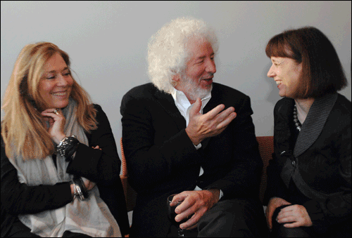 Jorie Graham and former Academy executive director Tree Swenson with Daniel Halpern before a reading in his honor at NYU's Rosenthal Pavilion on May 6, 2010.