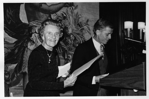 Photo © Dorothy Alexander Marie Bullock standing at the podium with James Merrill. see more photographs and ephemera from the archive