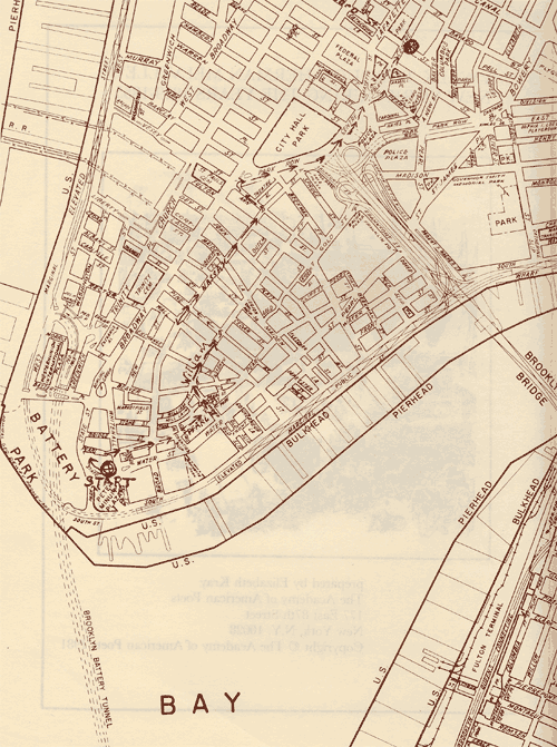 An image of the map of the walking tour of Herman Melville's New York City, prepared by former Academy of American Poets executive director Betty Kray in 1981.