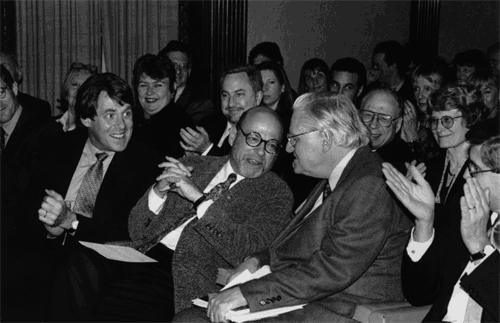 (Left to right) Former executive director William Wadsworth and Richard Howard applauding John Ashbery at an Academy of American Poets' awards ceremony.