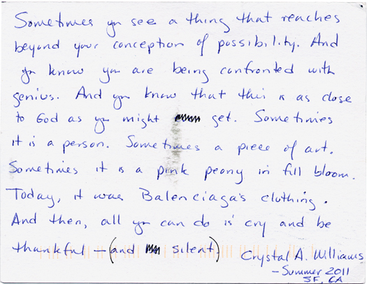 Postcard from Crystal Williams. Postmarked July 7, 2011, Oregon.