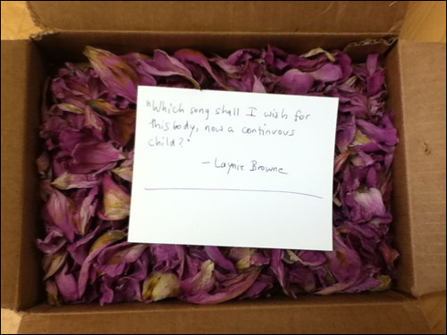 Postcard/materials from G. C. Waldrep. "Which song shall I wish for this body, now a continuous child?" —Laynie Browne. Postmarked July 19, 2011, Pennsylvania.