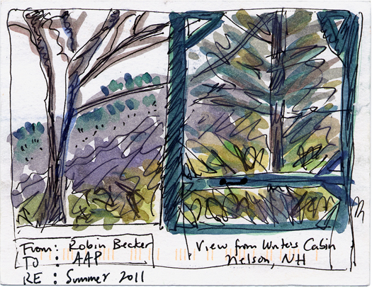 Postcard from Robin Becker. "View from Writers Cabin, Nelson, NH." Postmarked July 2011, New Hampshire.