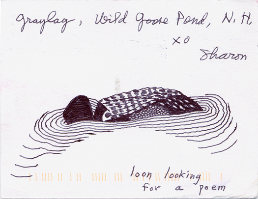 Postcard from Sharon Olds. “Graylag, Wild Goose Pond, NH” Postmarked July 6, 2011, New Hampshire.