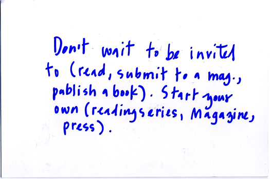 Don't wait to be invited to (read, submit to a magazine, publish a book). Start your own (reading series, magazine, press).